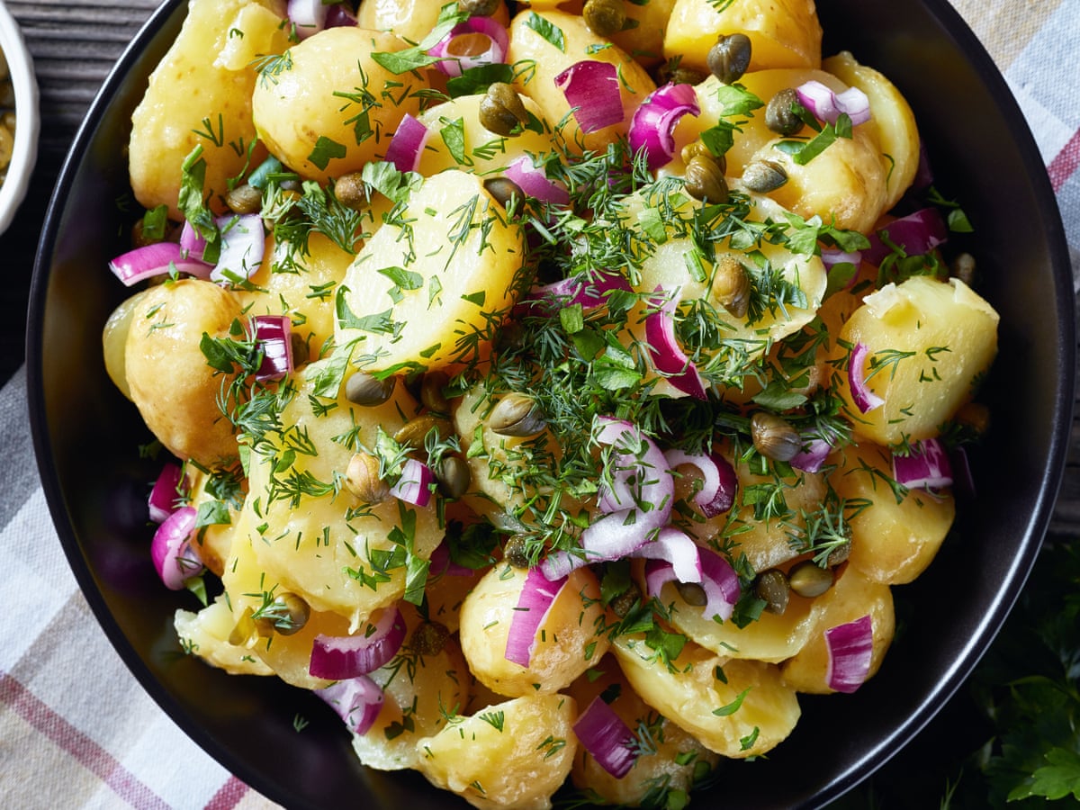 Serve as a side at bbq. In a separate pan boil the baby potatoes for 20 minutes in salted water. You want to make sure you. A warm potato salad with piquant olives capers and hints of pickled chilli make a delicious filling for sweet red peppers.